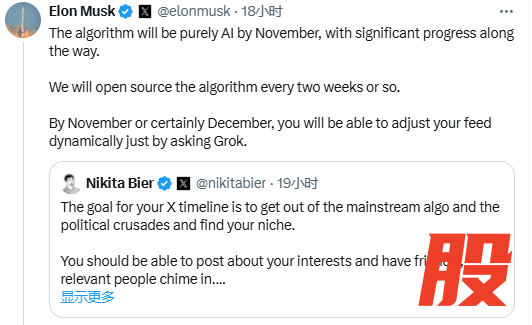 马斯克回应称:“到11月时,算法将完全由人工智能驱动,并且在此过程中会取得重大进展。我们每隔两周左右就会公开算法的源代码。到11月或者最晚12月,你只需向 Grok 发出指令,就能动态地调整你的信息流了。”