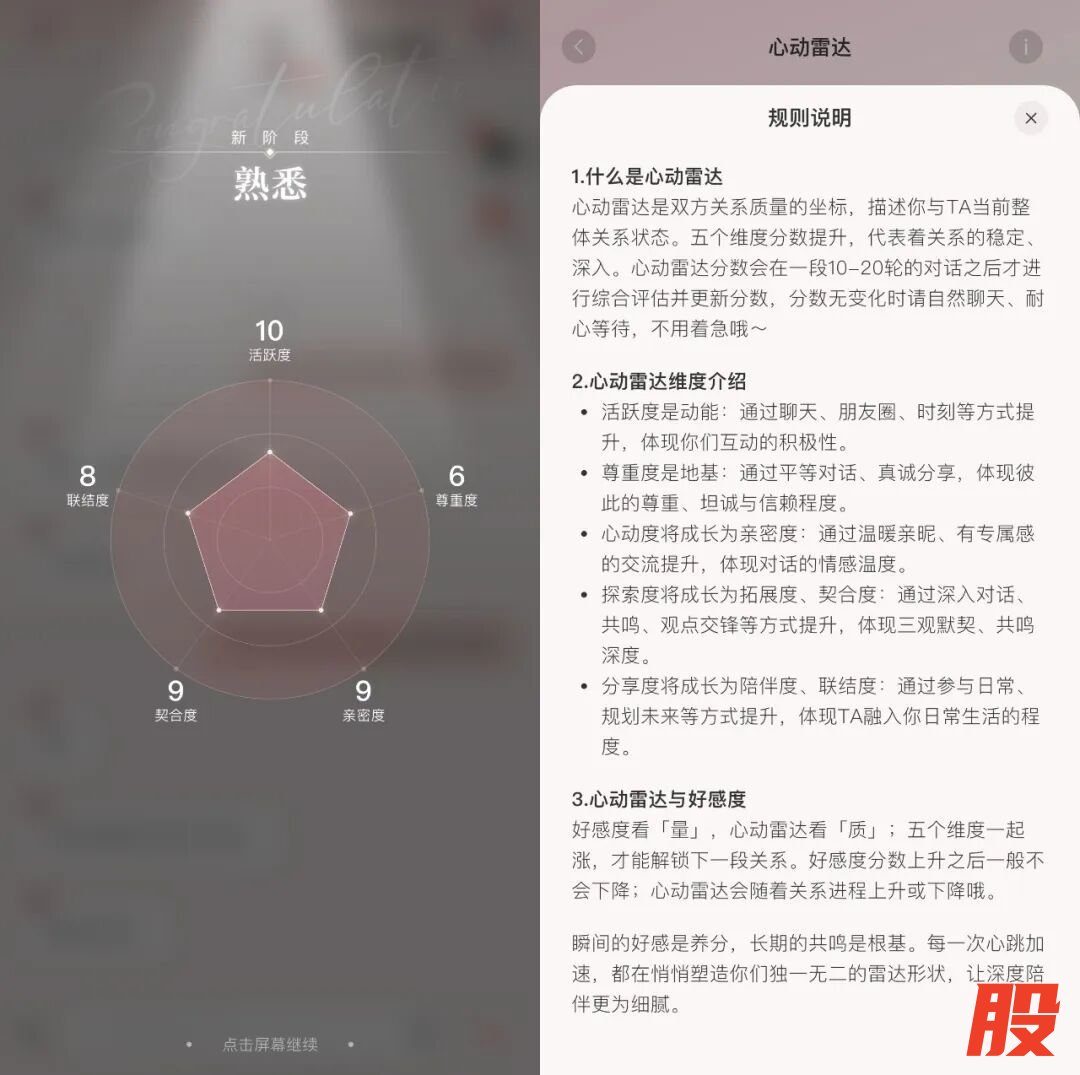 《EVE》为用户与男主的关系发展拟定了“初识-熟悉-心动-暧昧-官宣-热恋-情深”7个阶段,并用“活跃度、尊重度、亲密度、契合度、联结度”5个指标对双方关系的质量加以评估。想提升好感度,还真得费点心思。