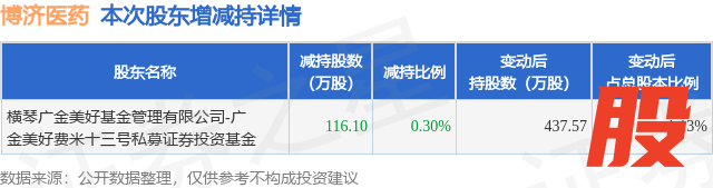 证券之星消息,10月17日博济医药发布公告《博济医药:关于控股股东及其一致行动人减持股份进展暨权益变动触及1%的公告》,其股东横琴广金美好基金管理有限公司-广金美好费米十三号私募证券投资基金于2025年9月12日至2025年10月17日间合计减持116.1万股,占公司目前总股本的0.3011%,变动期间该股股价下跌9.58%,截止10月17日收盘报9.72元。